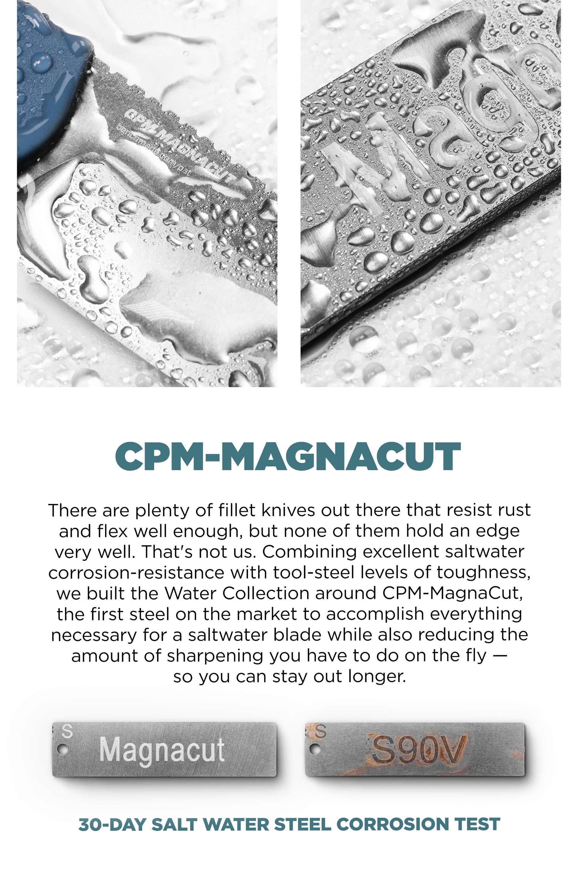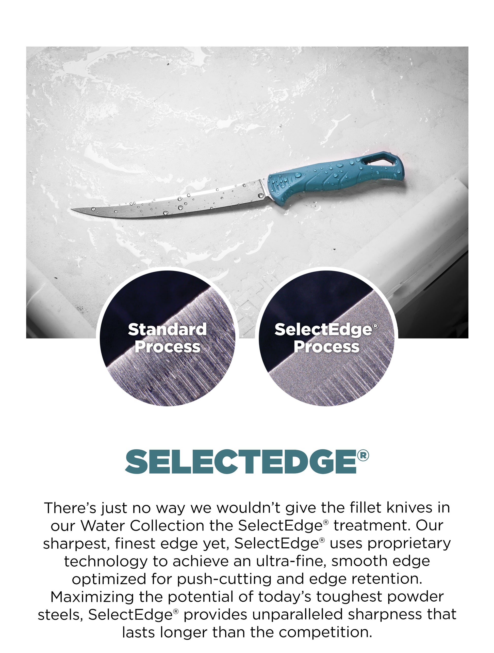 When it comes to processing the day’s catch, we believe in the theory of "Fish more, sharpen less." Fashioned with a large 9” trailing-point blade of CPM-MagnaCut steel with SelectEdge® tech, the Fishcrafter excels at filleting medium to large fish where that extra length makes for a smooth, clean cut. Featuring a long, straight edge for stability in the cut and upswept tip for aiding in deboning, the 9” Fishcrafter™ with its durable Santoprene® handle has a finger guard with jimping to prevent slipping during push-cuts.