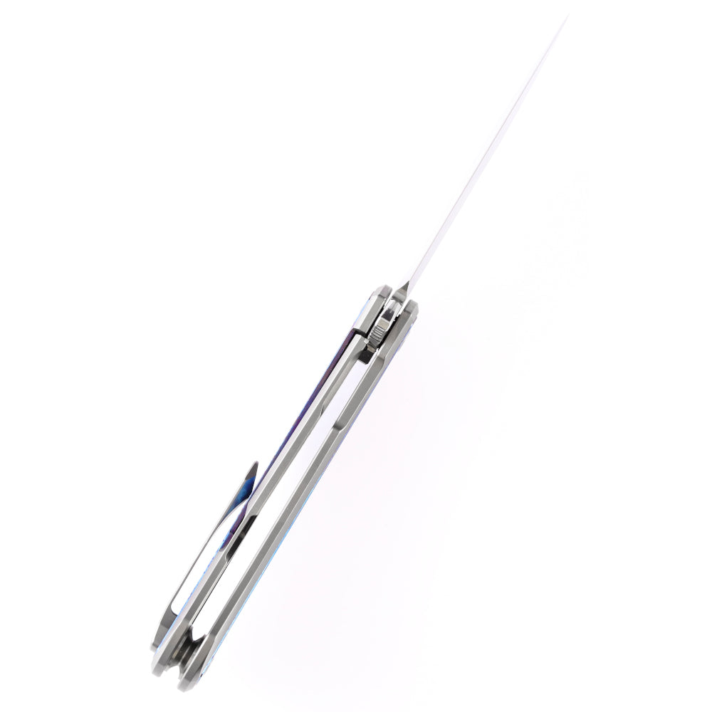 - Ergonomic titanium handle with dual timascus inlays for a smooth gripping surface that is comfortable in the pocket or hand.