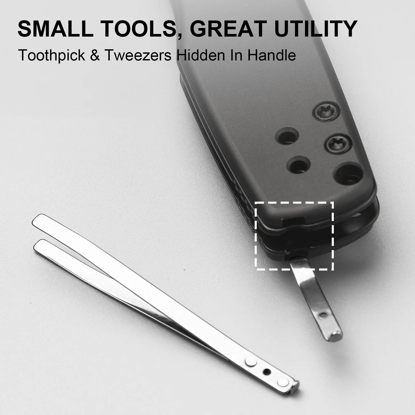 Ingeniously integrated small tools enhance everyday carry utility: the stainless steel toothpick and tweezers are discreetly stored inside the handle, providing quick access while maintaining a sleek exterior.