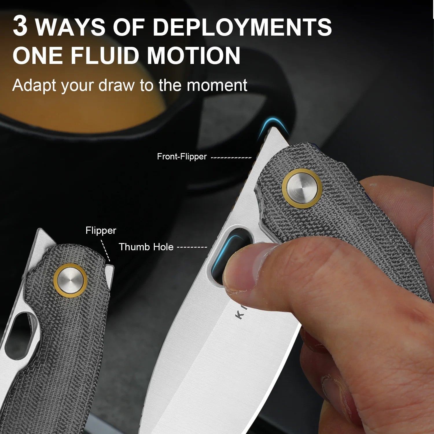 The front flipper allows fast opening with your index finger in a tactical grip. The Flipper design fits your thumb for easy pushing. The thumb hole option also enables fast one-handed opening. Whether for urgent tasks or daily use, you can easily set the opening pace