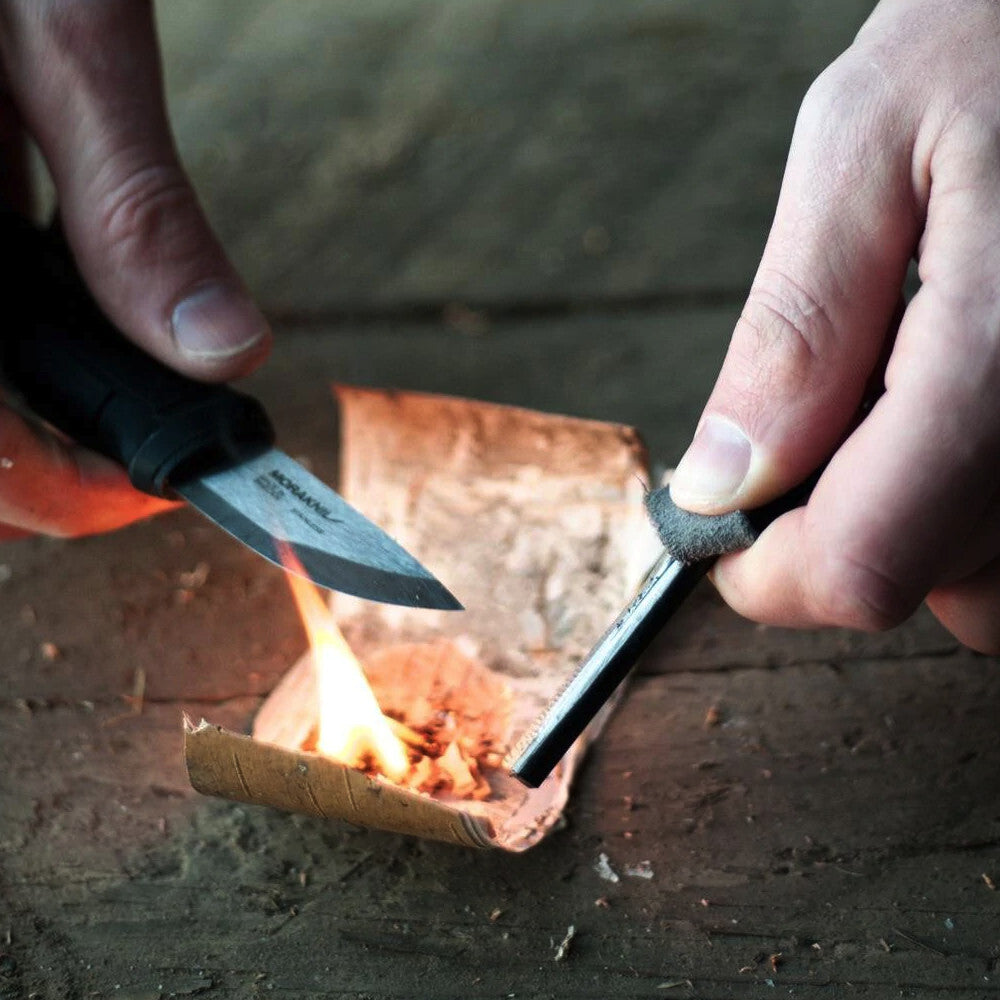The blade is made of high-quality Swedish stainless steel that is treated through our unique process in our factory in Mora. What’s more, the handy size of the blade suits the varied situations you can encounter on your hike, camping trip, or when hunting. The knife has a secure grip made out of two different polymers and a click lock, making the knife safe to handle. Perfect for both new and experienced adventurers. The Eldris kit takes you to the next level. A fire starter, paracord, and secondary lock mean that you get even more out of your Eldris knife and your time in the great outdoors.