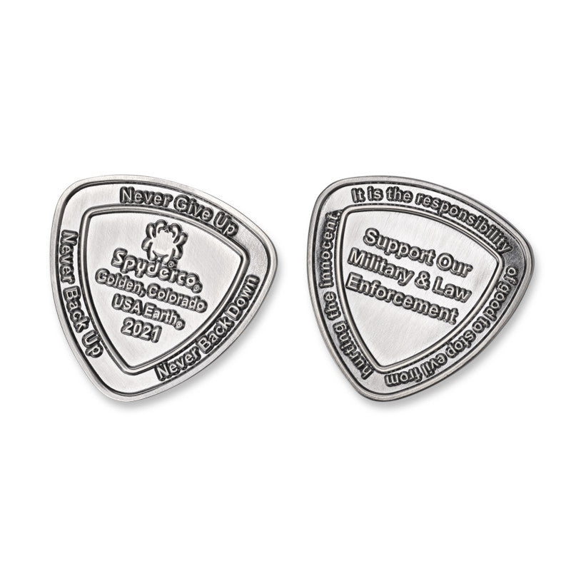 The 2021 SpyderCoin honors Spyderco’s unwavering support of our nation’s law enforcement and military personnel and their dedication to preserving our way of life. A vivid reflection of our company values, it reminds us that “It is the responsibility of good to stop evil from hurting the innocent,” and encourages us to “Never give up,” “Never back up,” and “Never back down.” This antique-nickel-finished coin is custom minted in a unique Reuleaux triangle shape and proudly bears the Spyderco logo and the year “2021.” Coin is 1.3" wide.