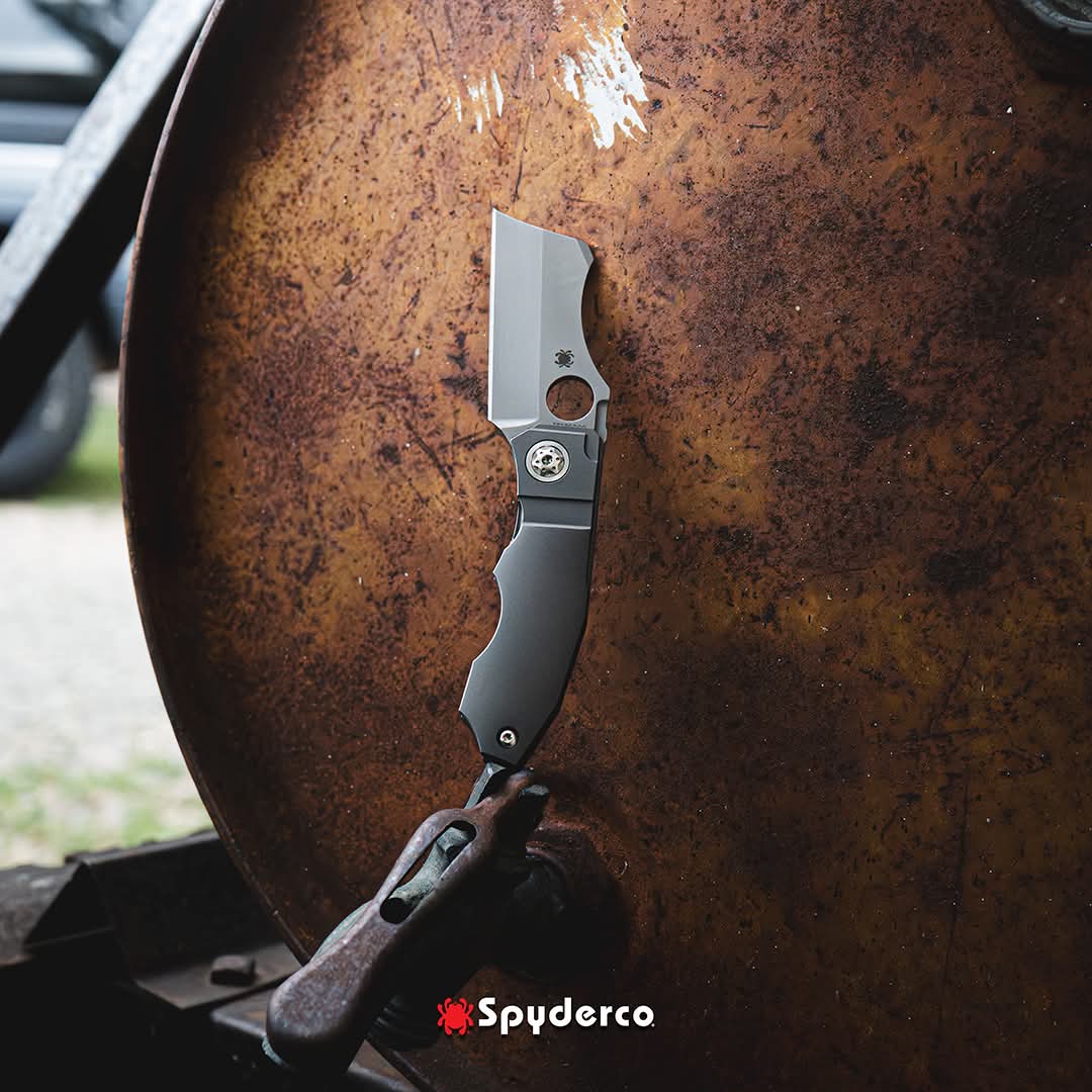 Inspired by custom knifemaker David Rydbom’s “Bill the Butcher” design, the Stovepipe blends dramatic style with serious performance. Its stout cleaver-shaped blade is crafted from 4mm (.157-inch) thick CPM® 20CV stainless steel and has a deep hollow grind for superior edge geometry. The handle is constructed from two slabs of solid titanium joined by a titanium backspacer. Both scales are painstakingly machined to create beautifully crowned outer surfaces and the reverse-side scale forms the foundation of the knife’s Reeve Integral Lock (R.I.L.) mechanism. The oversized pivot pin is machined with artistic accents and serves double duty as an overtravel stop for the lock bar. To allow convenient carry, the Stovepipe includes a machined titanium clip configured for right-side, tip-up carry. The clip, scales, backspacer, and blade all feature a no-nonsense, industrial-style stonewashed finish. Comes in a Spyderco zipper pouch.